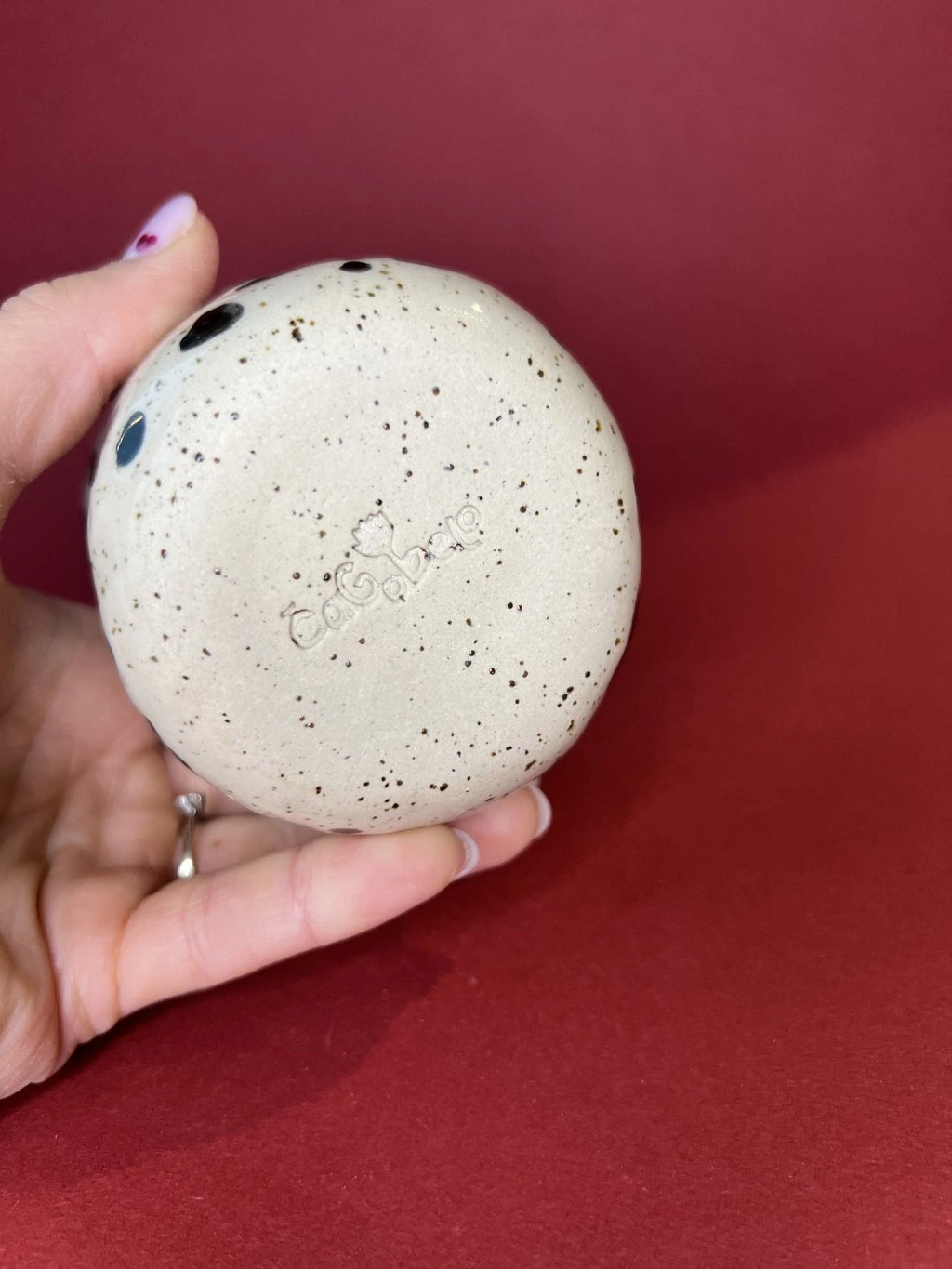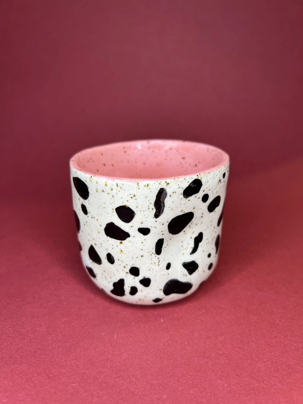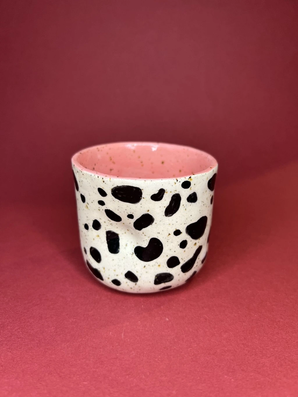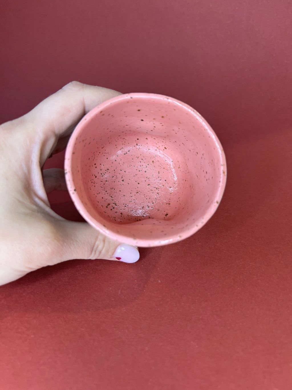 Tenhle cupík si při vzniku našel vlastní cestu. Transparentní glazura u něj rozhodla o výsledné podobě víc, než bych si původně přála. I když je hlína správně vypálená, povrch je jiný, než jaký bych chtěla posílat do světa jako užitkový hrnek.