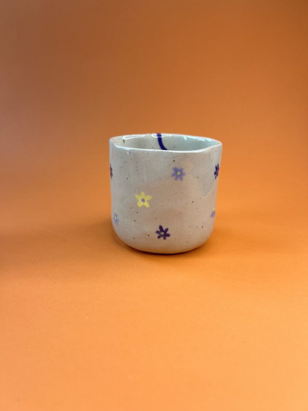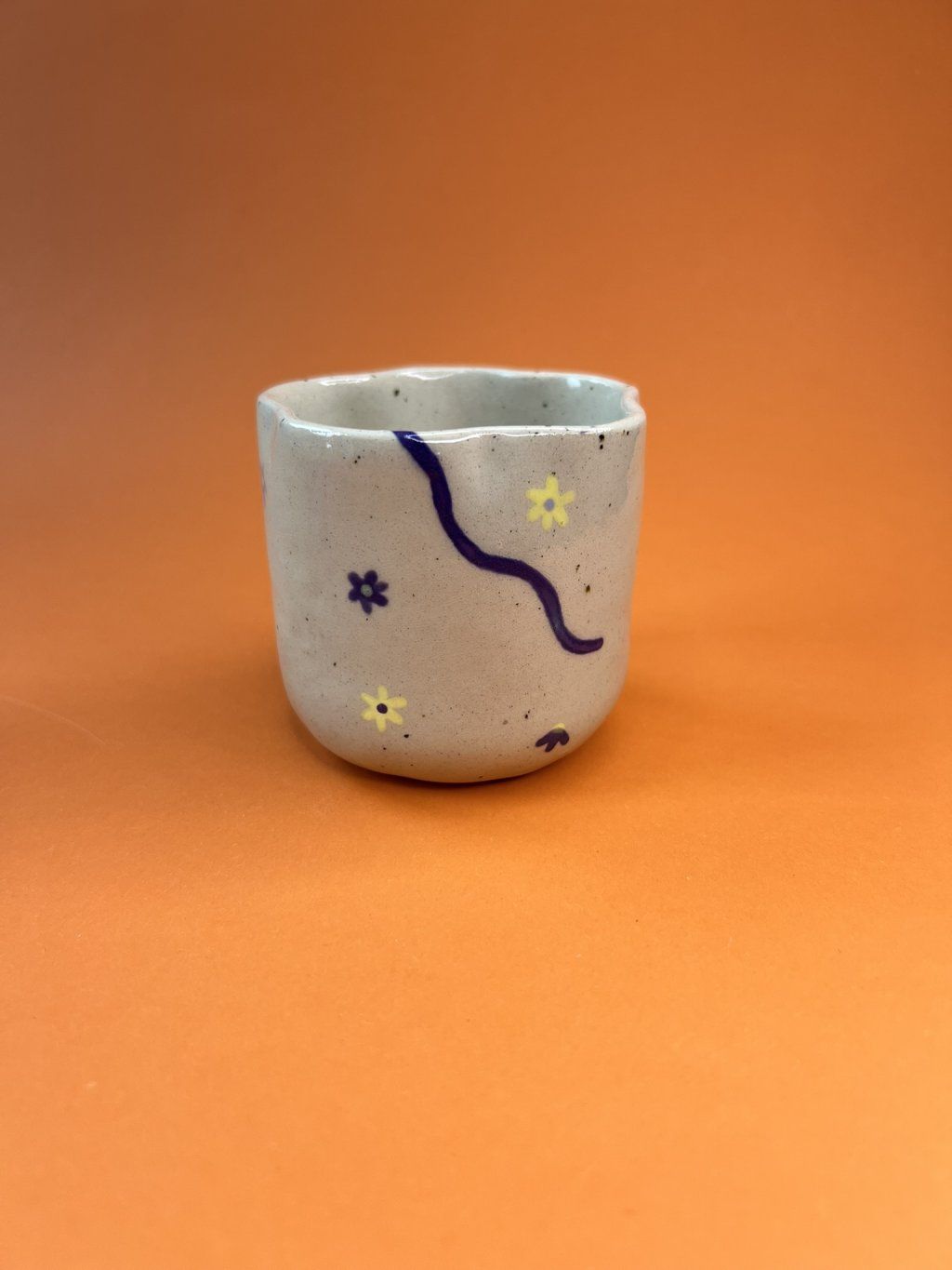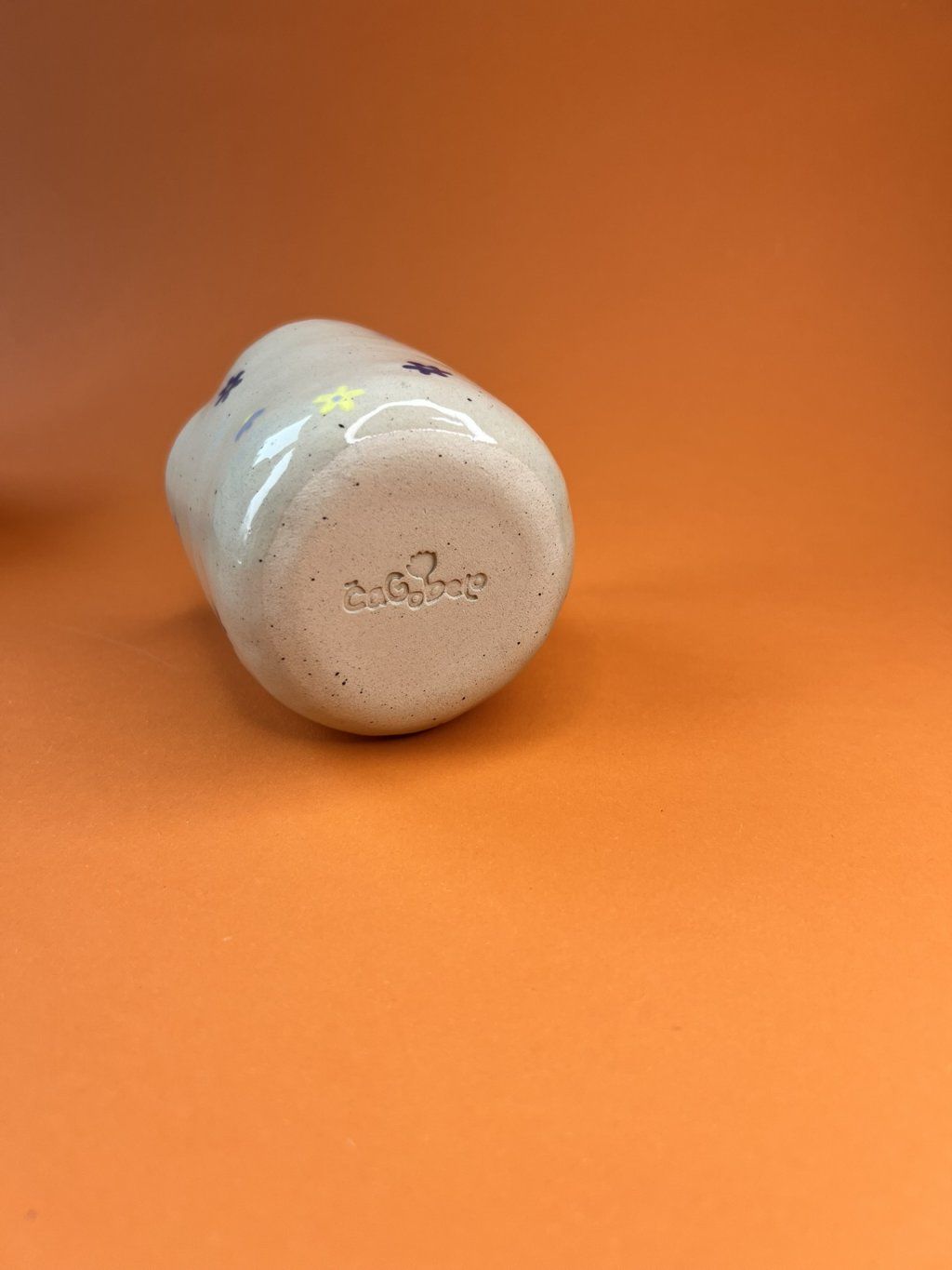 Hravý cupík s květinovým motivem, který vnese do každého dne malý kousek radosti. Je ručně tvarovaný z plátu hlíny, takže každý kus je originál a nese v sobě jedinečný otisk ruční práce. Jemné nerovnosti a drobné detaily mu dodávají přirozený, osobitý charakter. Ideální pro chvíle, kdy si chceš zpomalit a užít si svůj čaj nebo kávu trochu jinak...