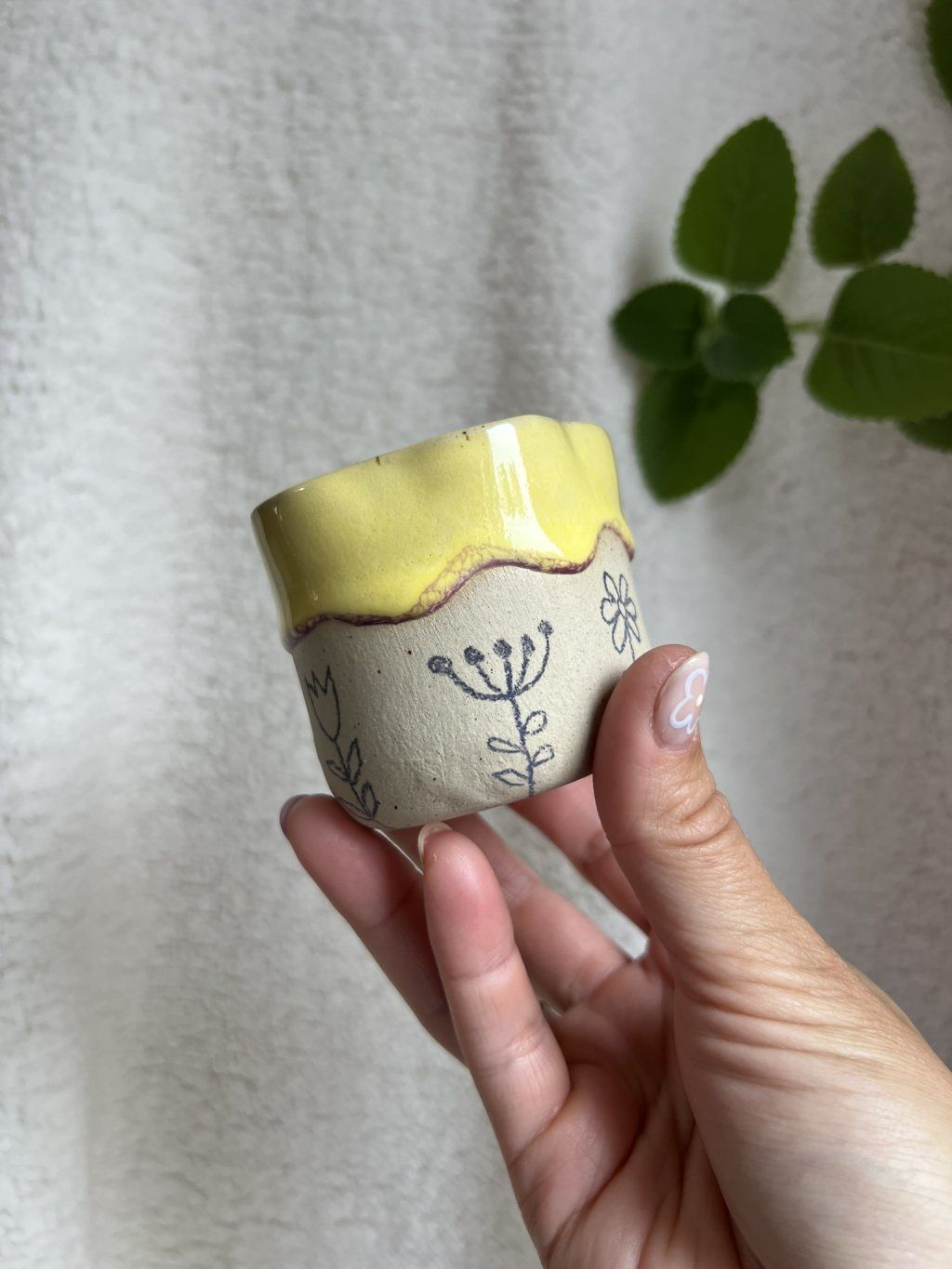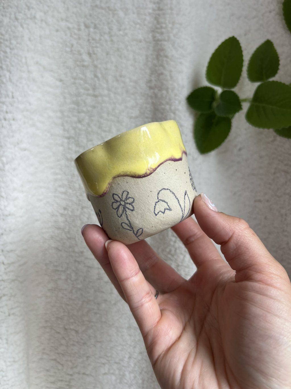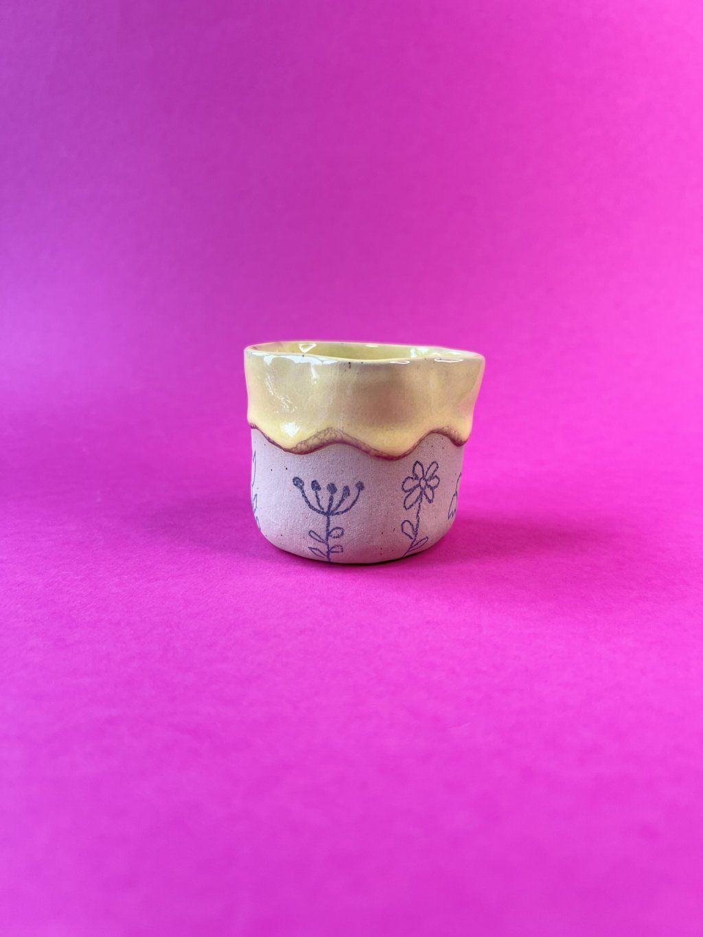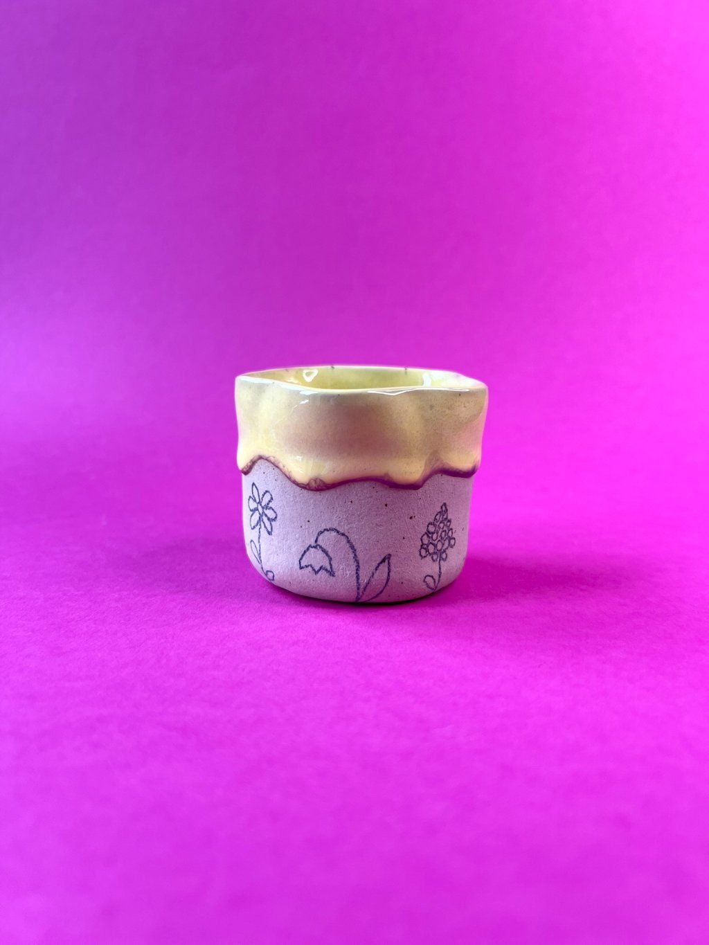 Cupík je ručně tvarovaný do podoby kvítku a zdobený jemnými obrysy květinek. Uvnitř se leskne měkká, máslově žlutá glazura (butter yellow), jemná a hřejivá – přesně taková, jaká je nálada prvního jarního dne.