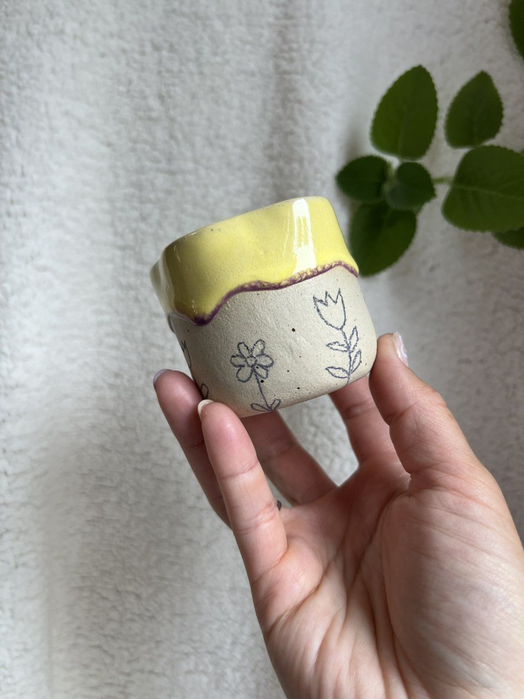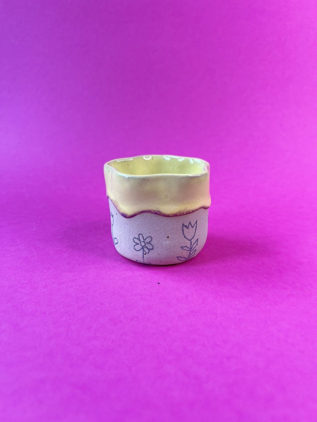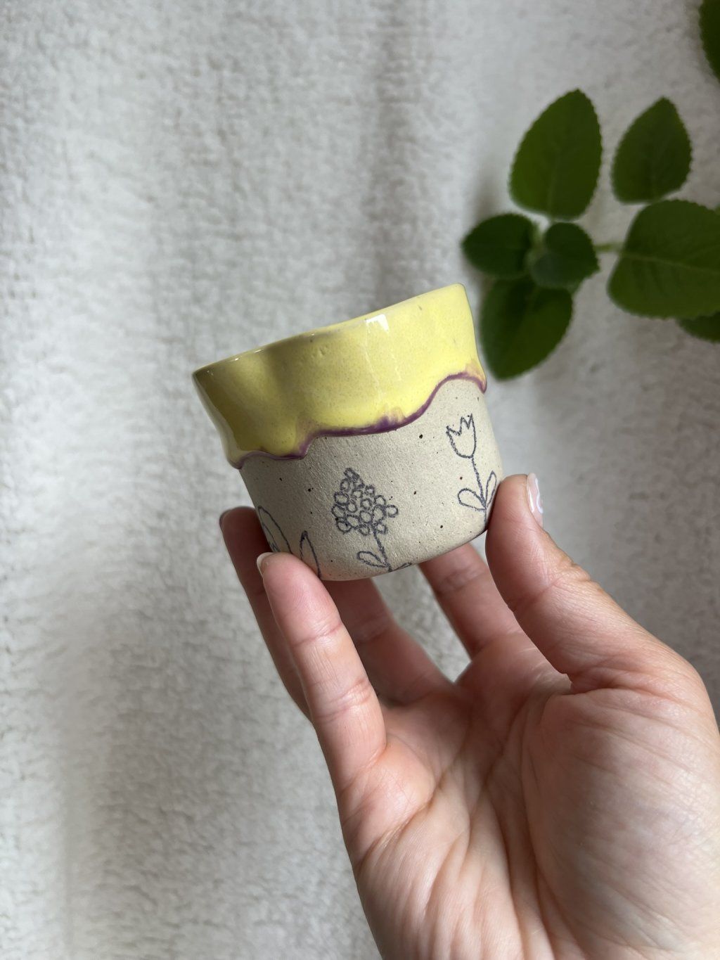 Cupík je ručně tvarovaný do podoby kvítku a zdobený jemnými obrysy květinek. Uvnitř se leskne měkká, máslově žlutá glazura (butter yellow), jemná a hřejivá – přesně taková, jaká je nálada prvního jarního dne.