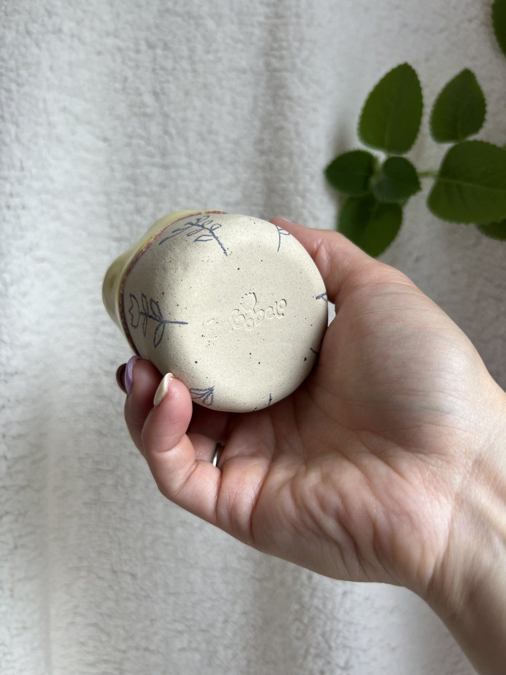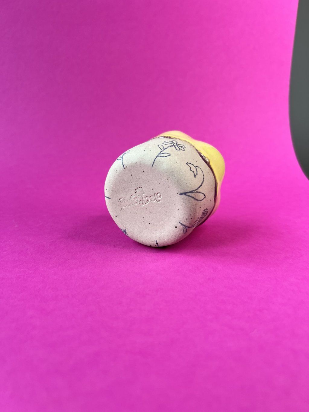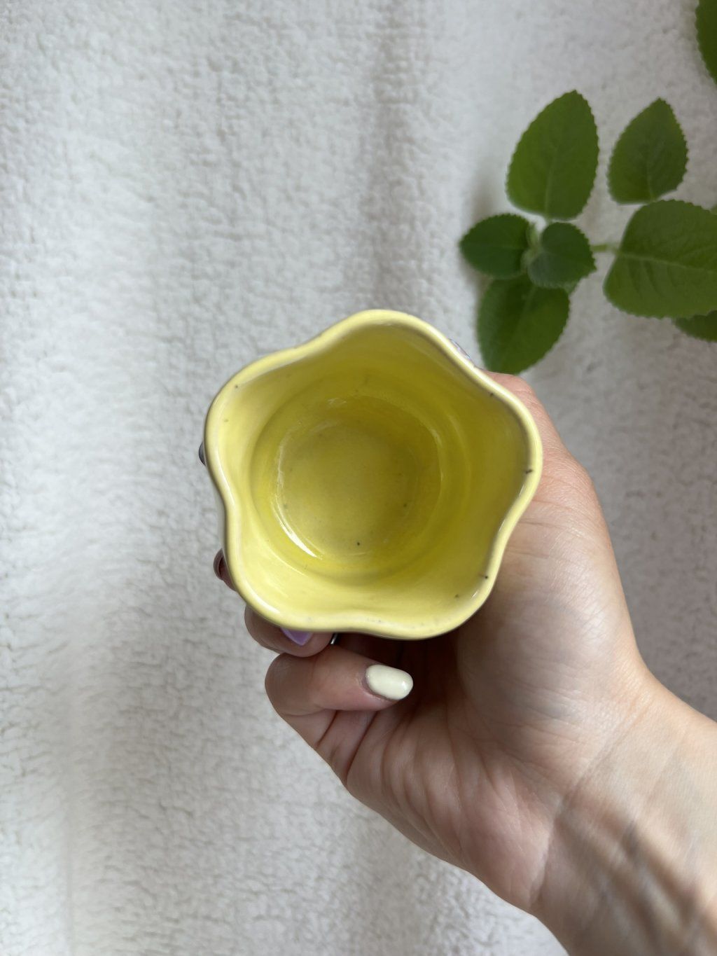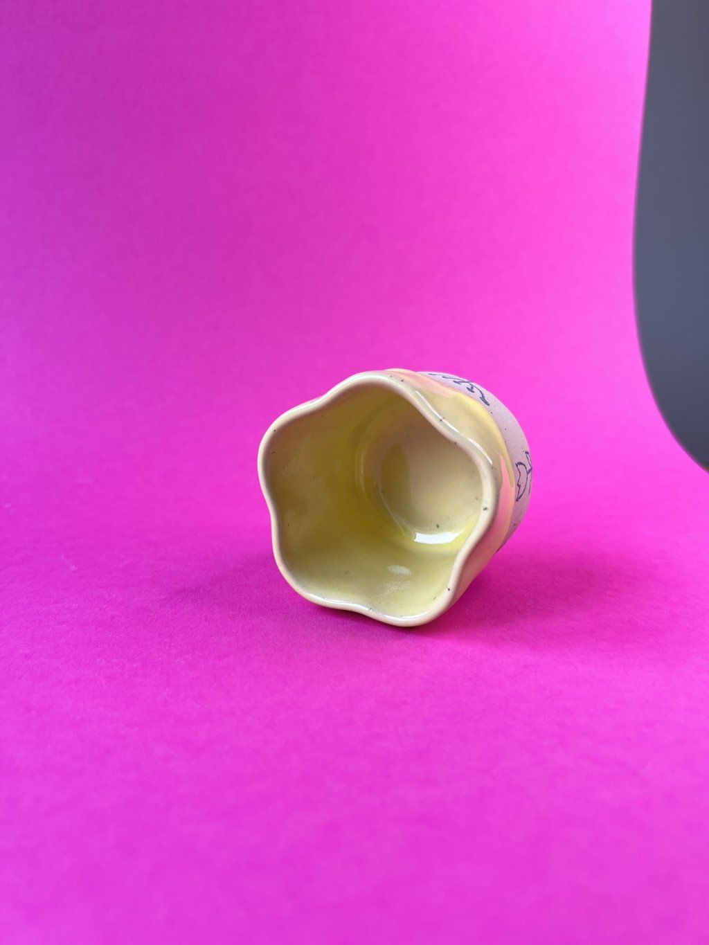 Cupík je ručně tvarovaný do podoby kvítku a zdobený jemnými obrysy květinek. Uvnitř se leskne měkká, máslově žlutá glazura (butter yellow), jemná a hřejivá – přesně taková, jaká je nálada prvního jarního dne.