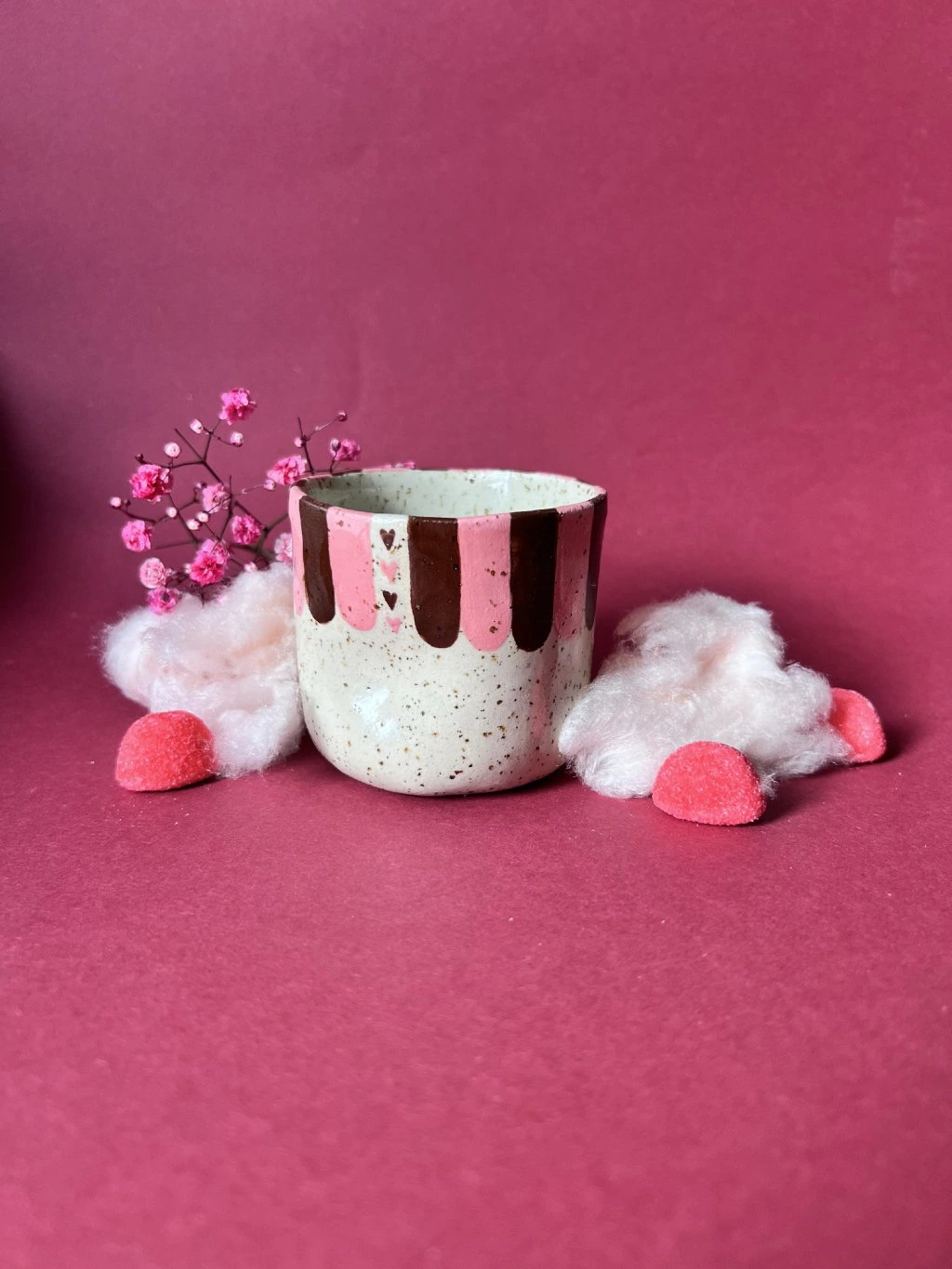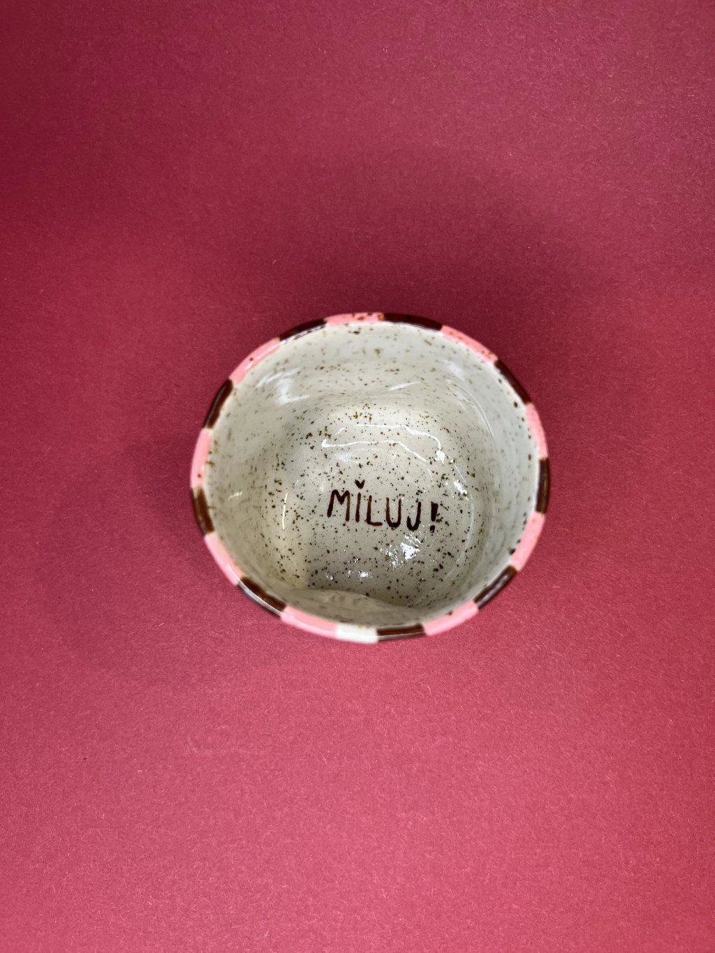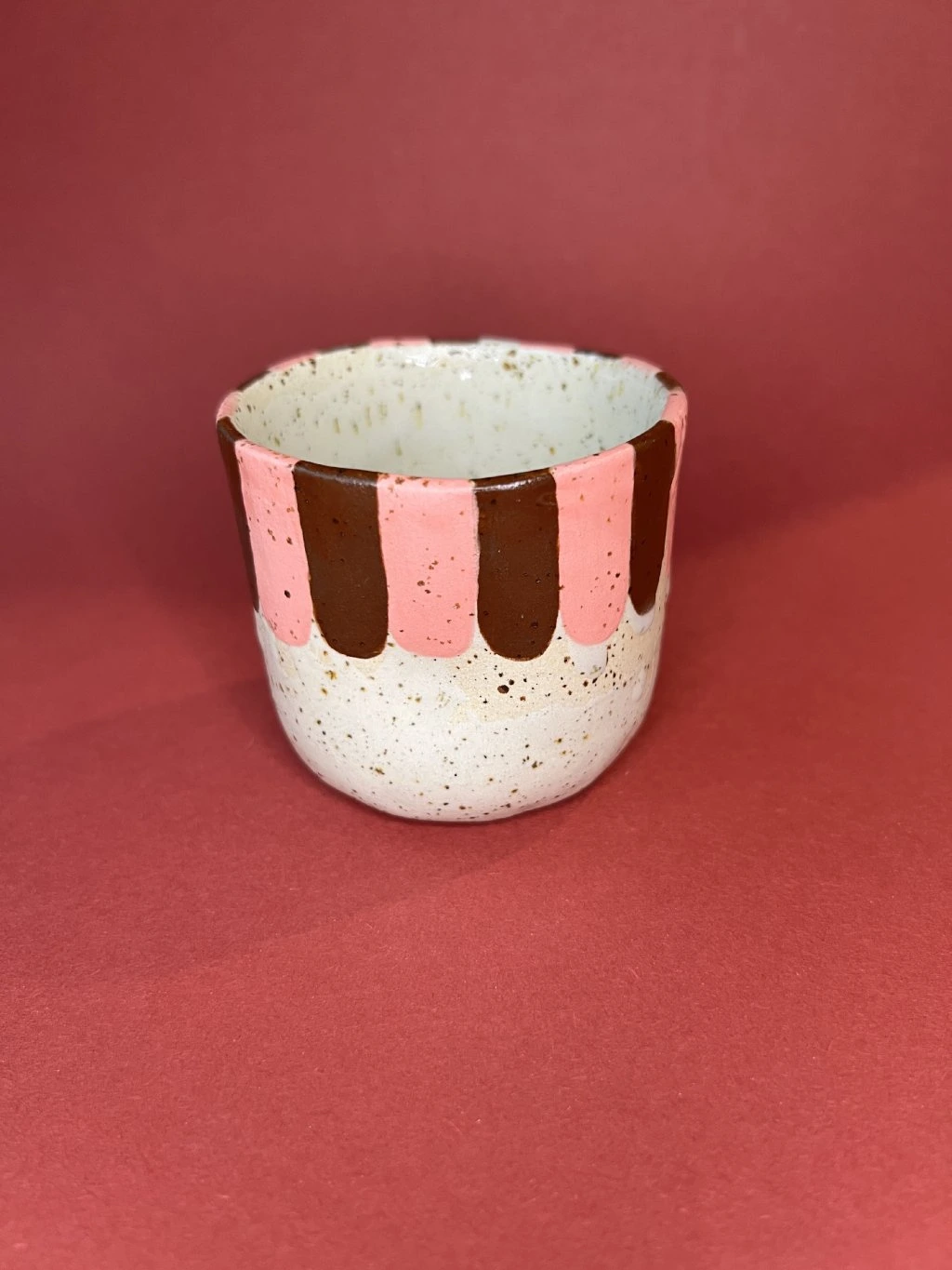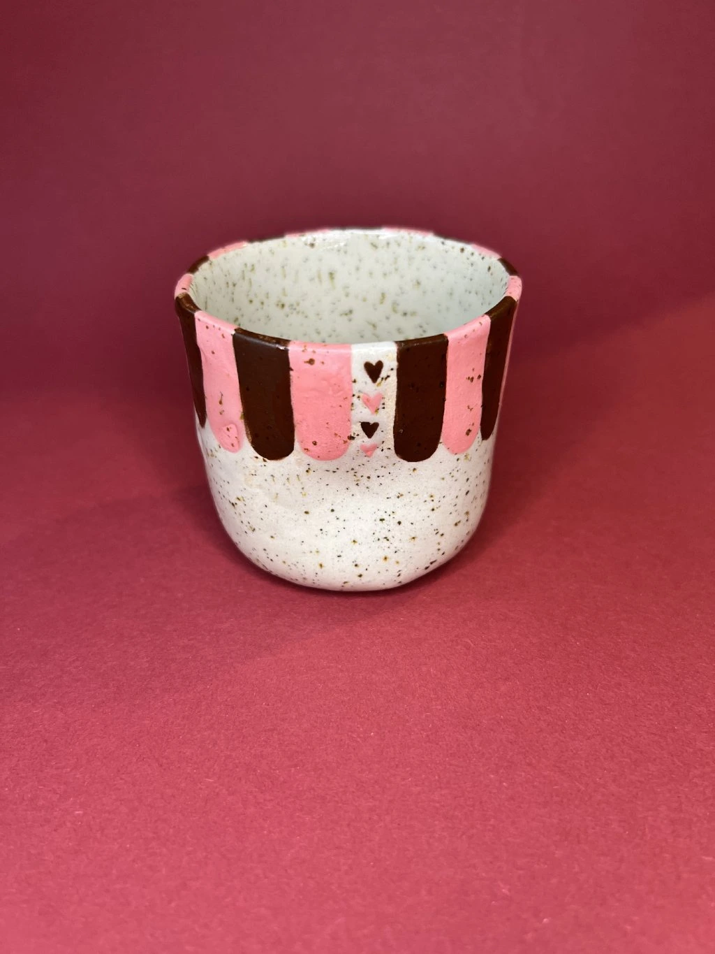 Tenhle cupík si při vzniku našel vlastní cestu. Transparentní glazura u něj rozhodla o výsledné podobě víc, než bych si původně přála. I když je hlína správně vypálená, povrch je jiný, než jaký bych chtěla posílat do světa jako užitkový hrnek.