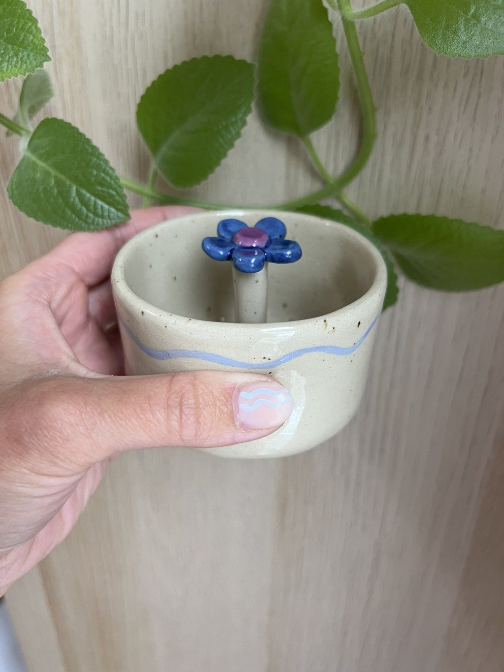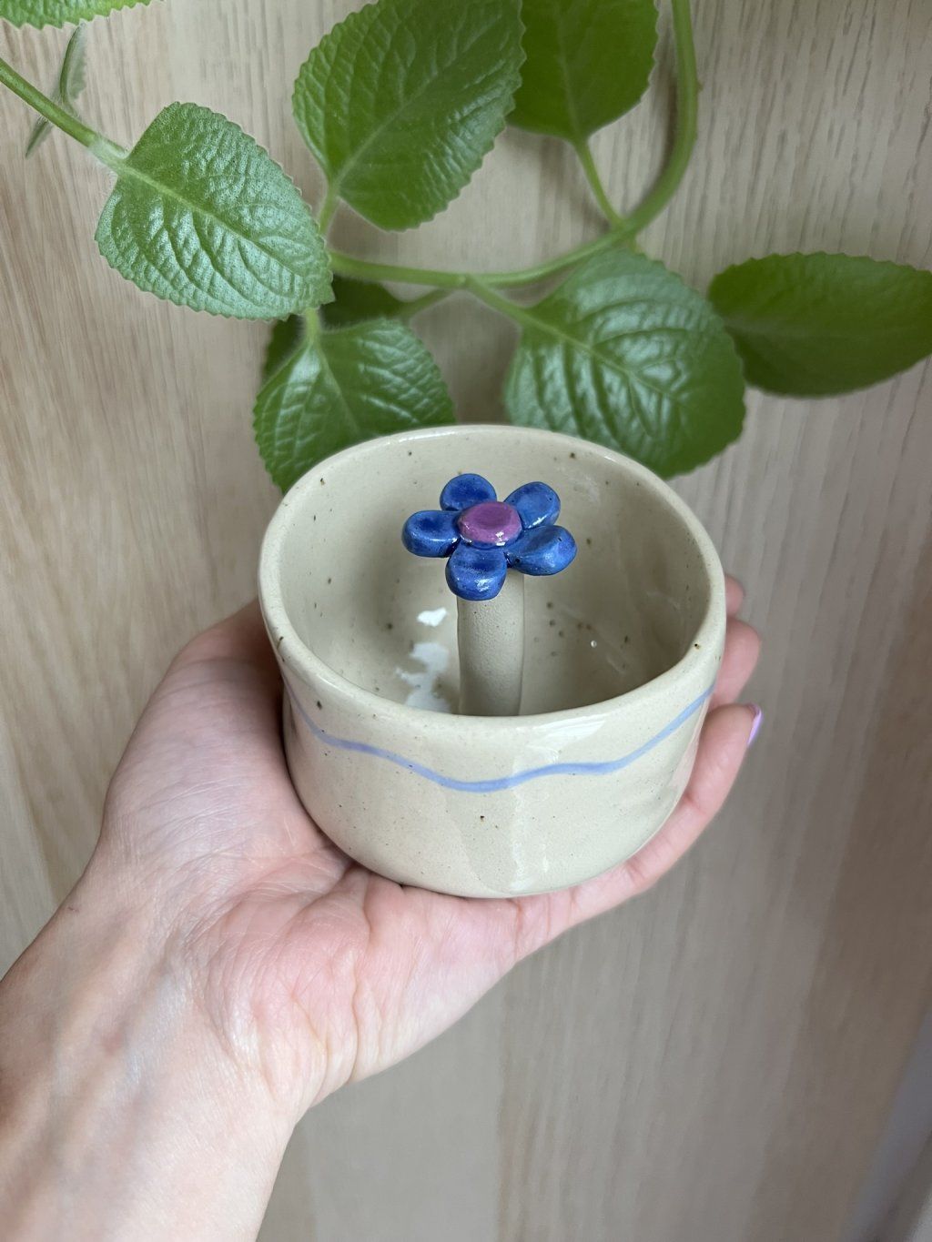 Je ručně tvarovaný z plátu hlíny, takže každý kus je originál a nese v sobě jedinečný otisk ruční práce. Jemné nerovnosti a drobné detaily mu dodávají přirozený, osobitý charakter. Ideální pro chvíle, kdy si chceš zpomalit a užít si svůj čaj nebo kávu trochu jinak...