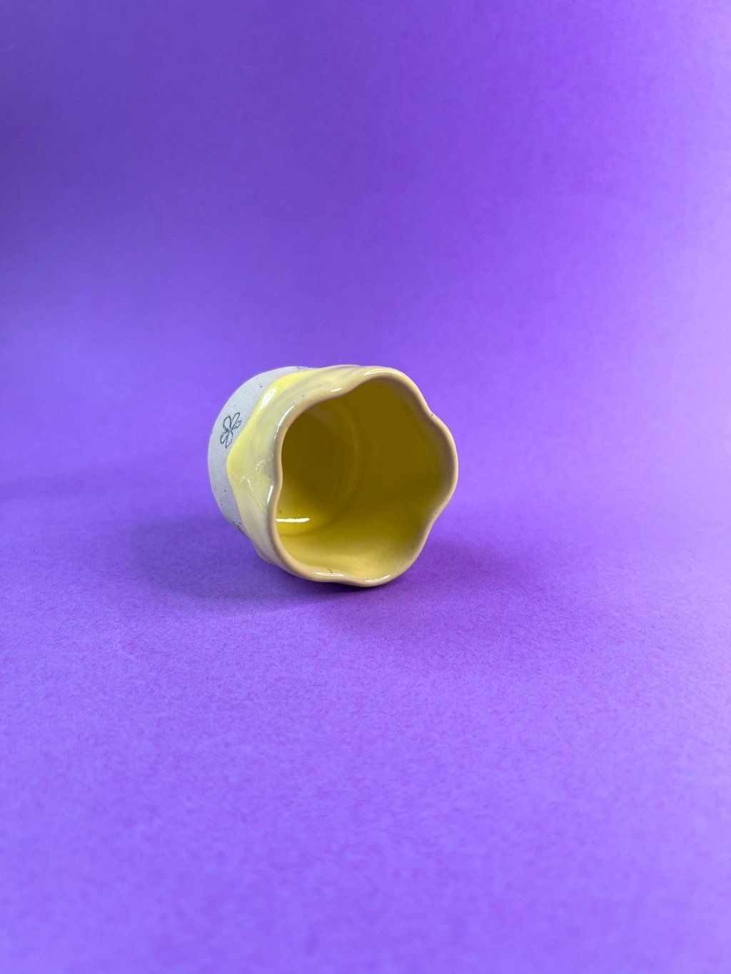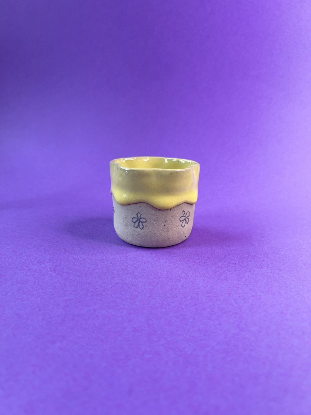 Cupík je ručně tvarovaný do podoby kvítku a zdobený jemnými obrysy květinek. Uvnitř se leskne měkká, máslově žlutá glazura (butter yellow), jemná a hřejivá – přesně taková, jaká je nálada prvního jarního dne.