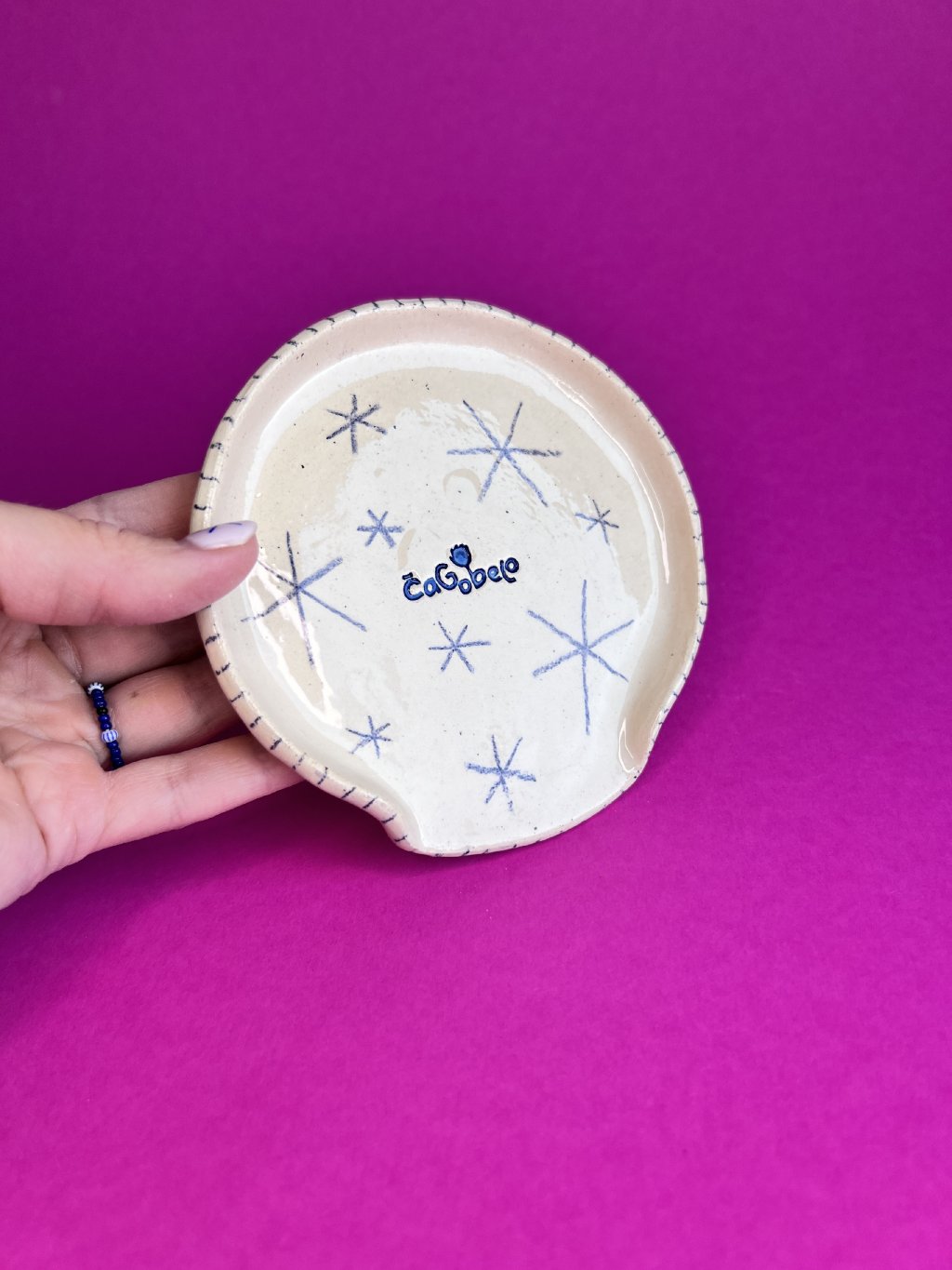 Talířek je ručně vymodelován z vyváleného plátu hlíny a dozdobený podglazurní tužkou, což z něj dělá rozhodně jedinečný kousek a bude se hezky vyjímat na kuchyňské lince.